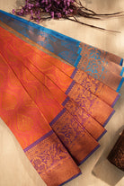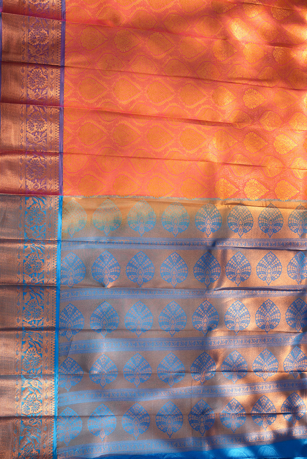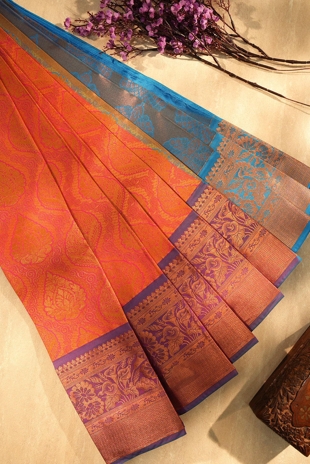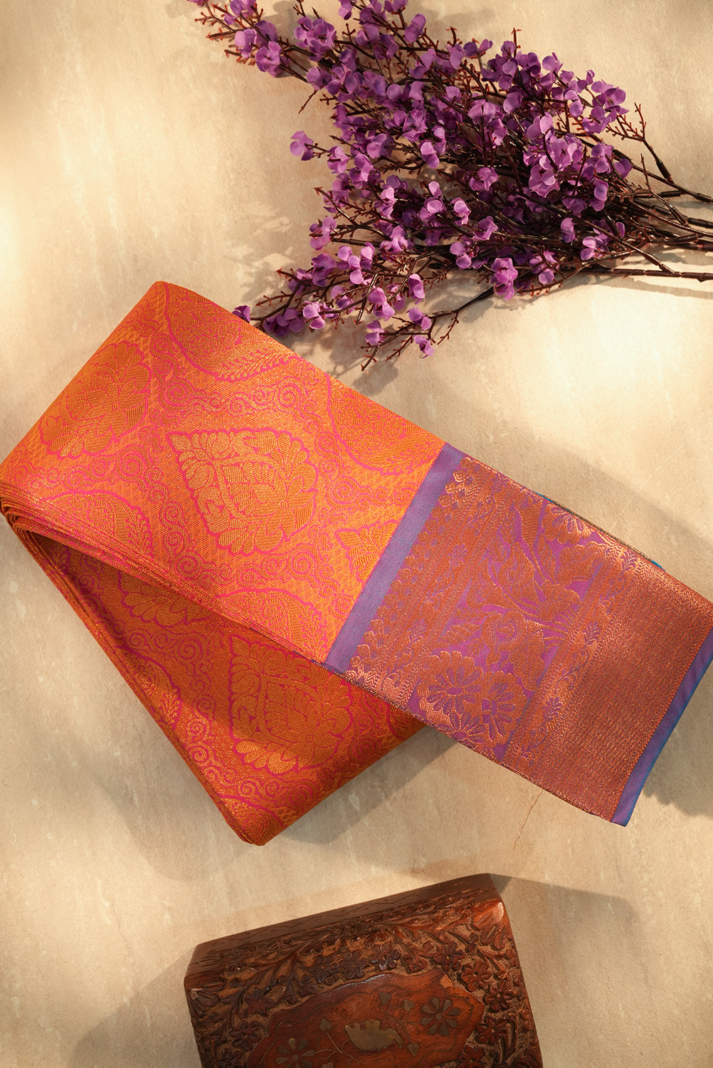 A mesmerizing interplay of colors, this saree glows with a vibrant orange-pink sheen reminiscent of a sunset. The look is anchored by a majestic violet border, woven heavily with gold zari vines for a truly regal finish. Unstitched blouse attached.