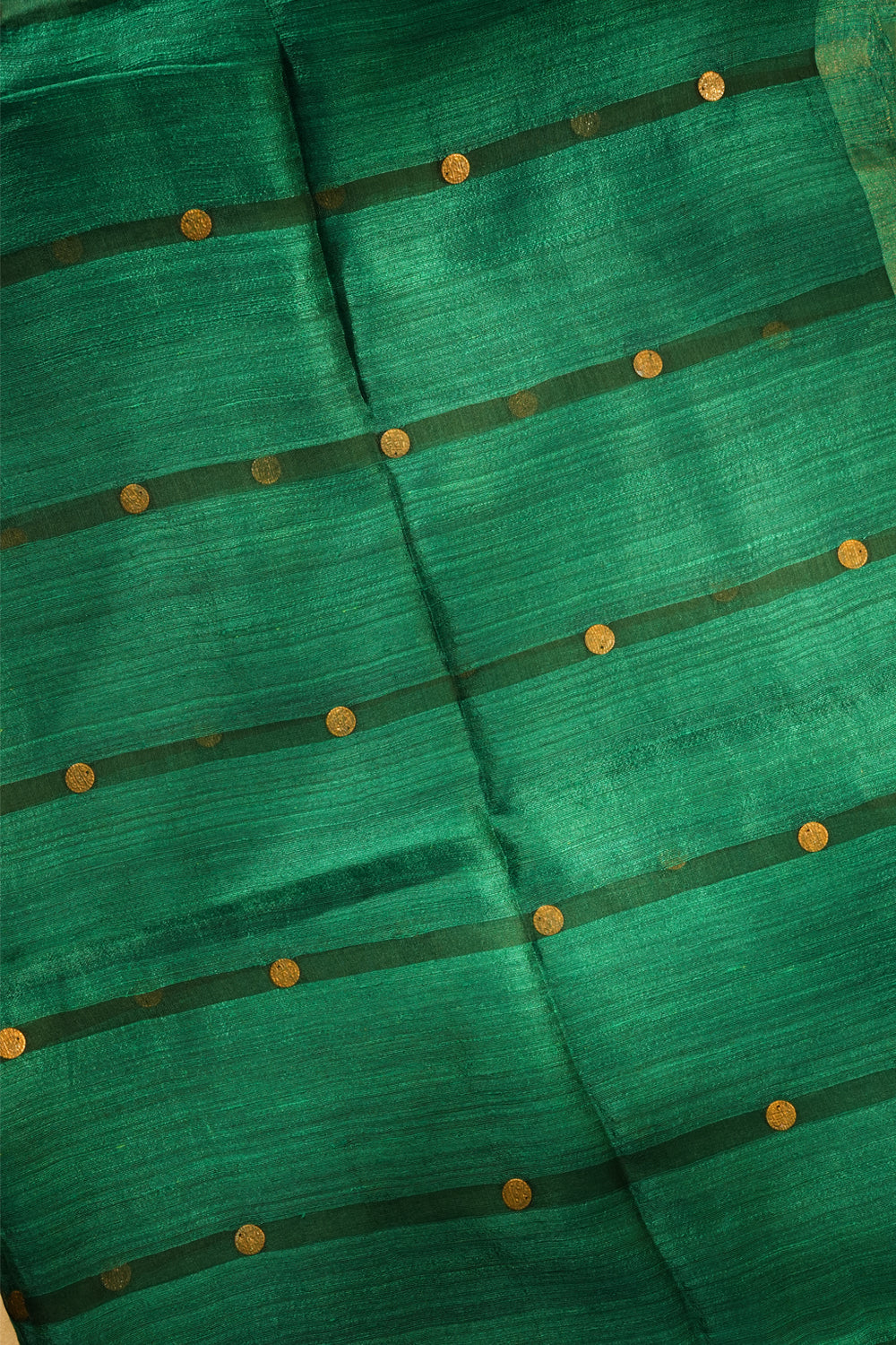 This is an exquisite, richly textured handloom silk saree in a captivating shade of Emerald Green or Deep Forest Green. The body features subtle woven horizontal stripes in a darker moss or hunter green tone, creating elegant contrast and texture. It is tastefully embellished with classic, circular coins in a warm antique gold finish. The fabric appears to be Tussar Silk, offering a beautiful, natural sheen and excellent drape. Unstitched blouse piece included.