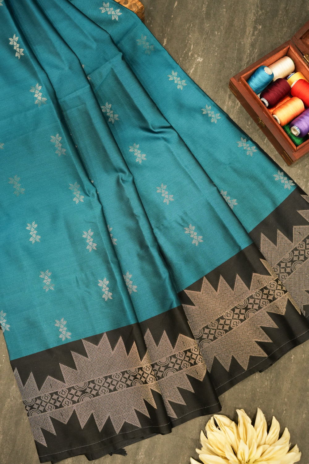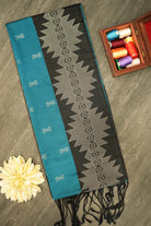 This beautiful soft silk saree features a vibrant teal blue body that transitions into a bold black and silver border. The intricate woven patterns and the delicate silver accents add a touch of glamour to this elegant piece, making it a timeless addition to your wardrobe. Unstitched blouse attached.