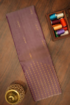 This silk saree has a sophisticated, muted purple shade that drapes beautifully. It's adorned with small, golden woven buttas on the body, giving it a delicate touch of sparkle. The saree's pallu and border have a more intricate, rich woven pattern, which adds to its luxurious feel. Unstitched blouse attached.