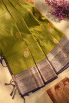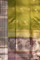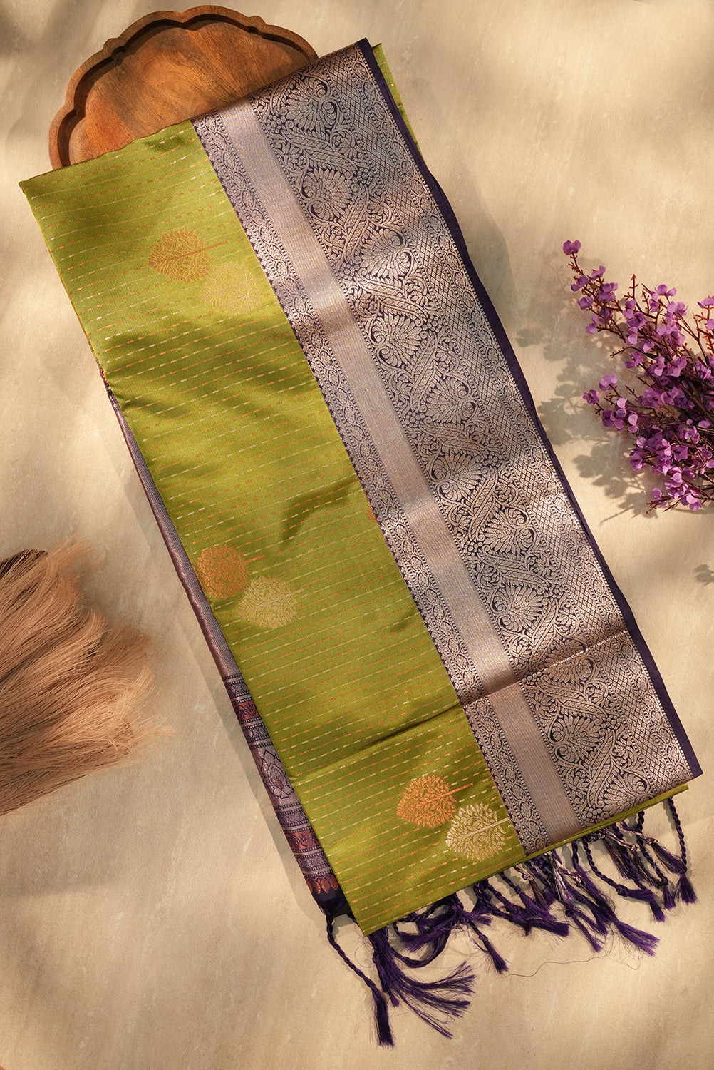 Radiant in olive green, this soft silk saree features delicate gold zari tree motifs (Buttas) and subtle vertical stripes. The contrast deep purple border is intricately woven with traditional floral patterns. Unstitched blouse attached.