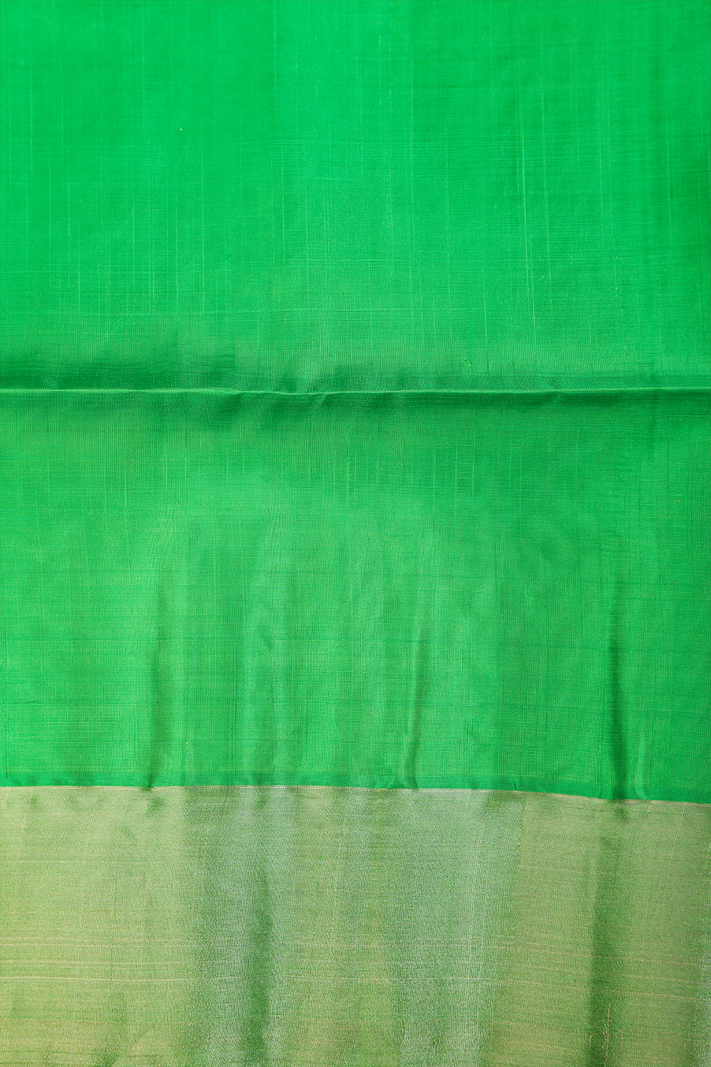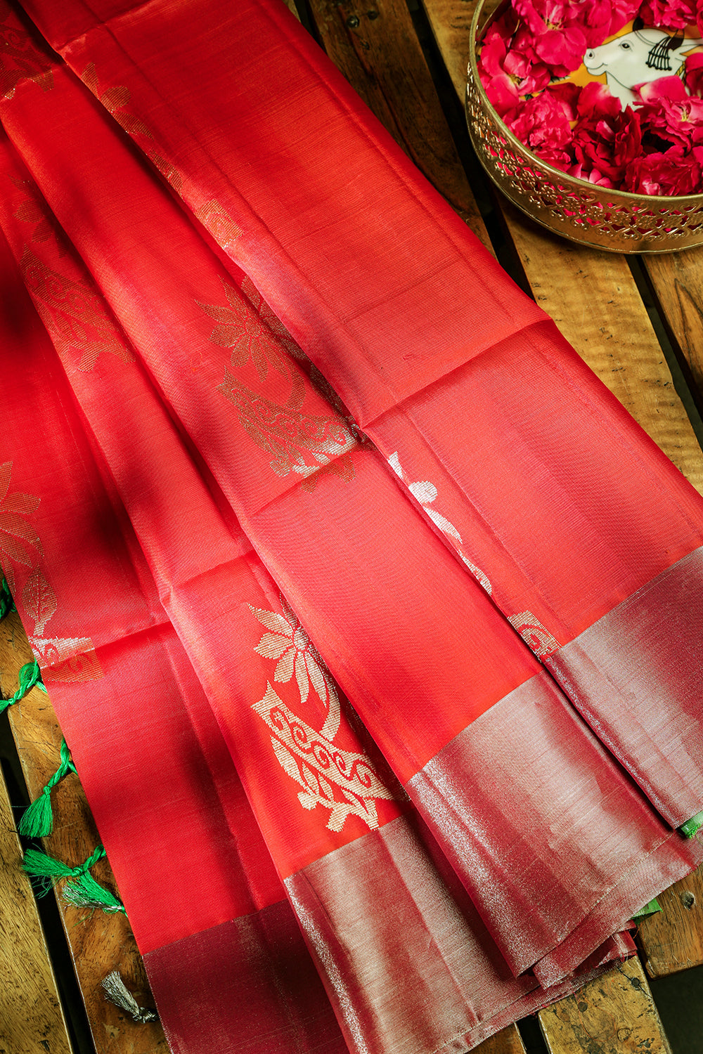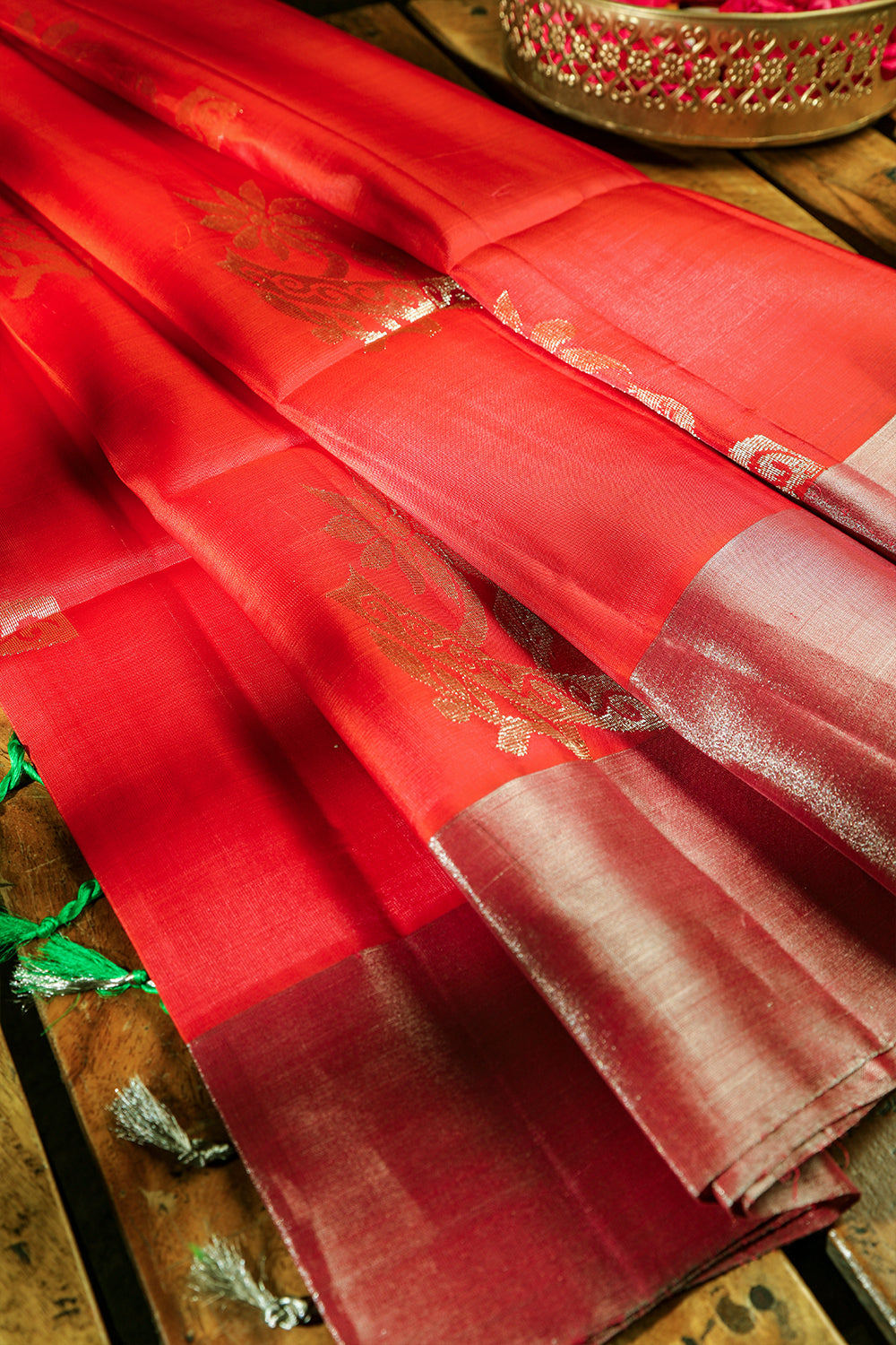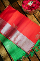 Orange with Green Soft Silk Saree having a beautiful floral motifs all over the body with zigzag gopuram pattern contrast green pallu unstitched blouse attached
