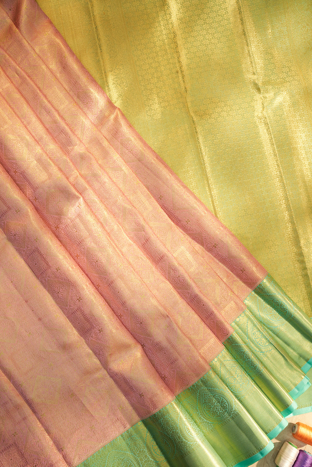 Embrace timeless elegance with this stunning silk saree. The body shimmers in a sophisticated peach-pink or blush pink, woven with subtle golden zari. It is beautifully contrasted by a vibrant pistachio green border, featuring intricate traditional motifs. Unstitched blouse attached.