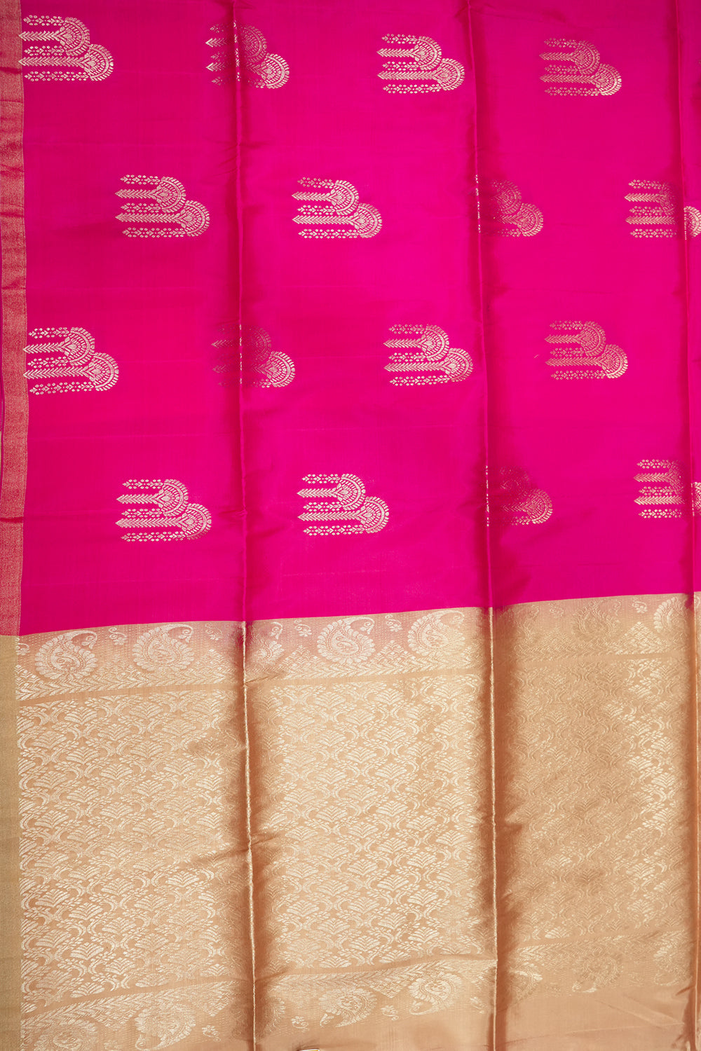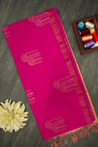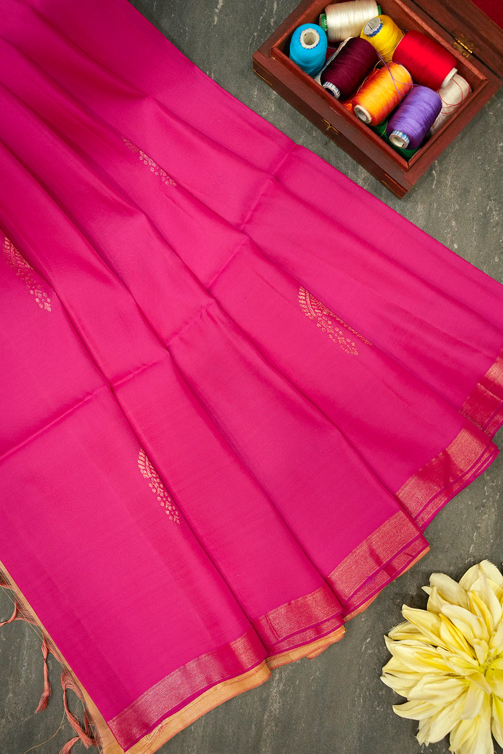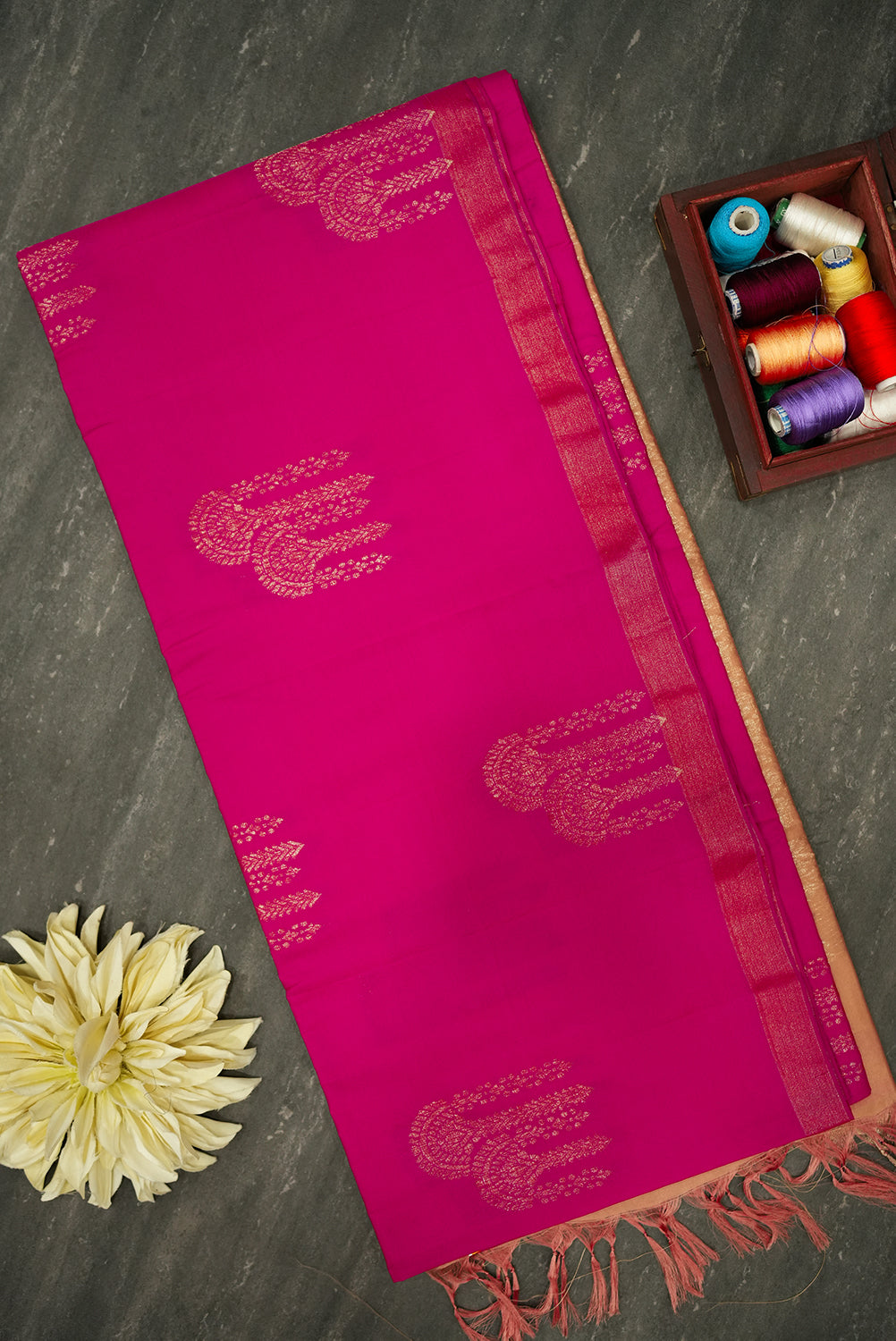 This stunning soft silk saree features a vibrant rani pink body, exuding a festive and joyful feel. It's elegantly adorned with intricate, golden, elephant-like motifs woven throughout the fabric, adding a touch of traditional artistry. The saree is finished with a thin border in a contrasting golden color and subtle tassels, making it a perfect choice for celebrations and special occasions.