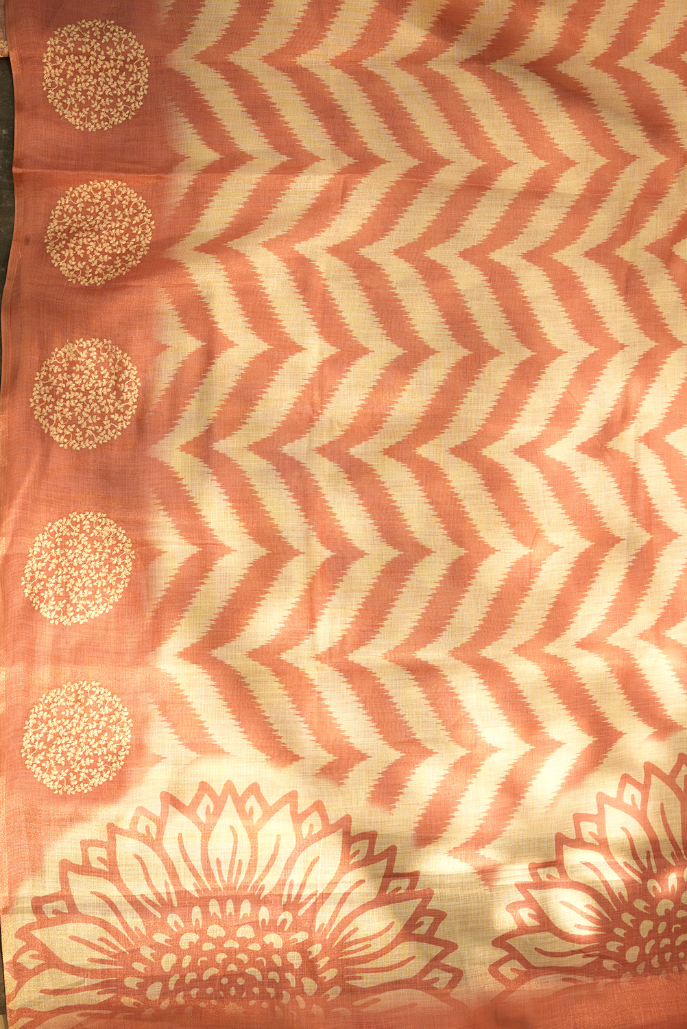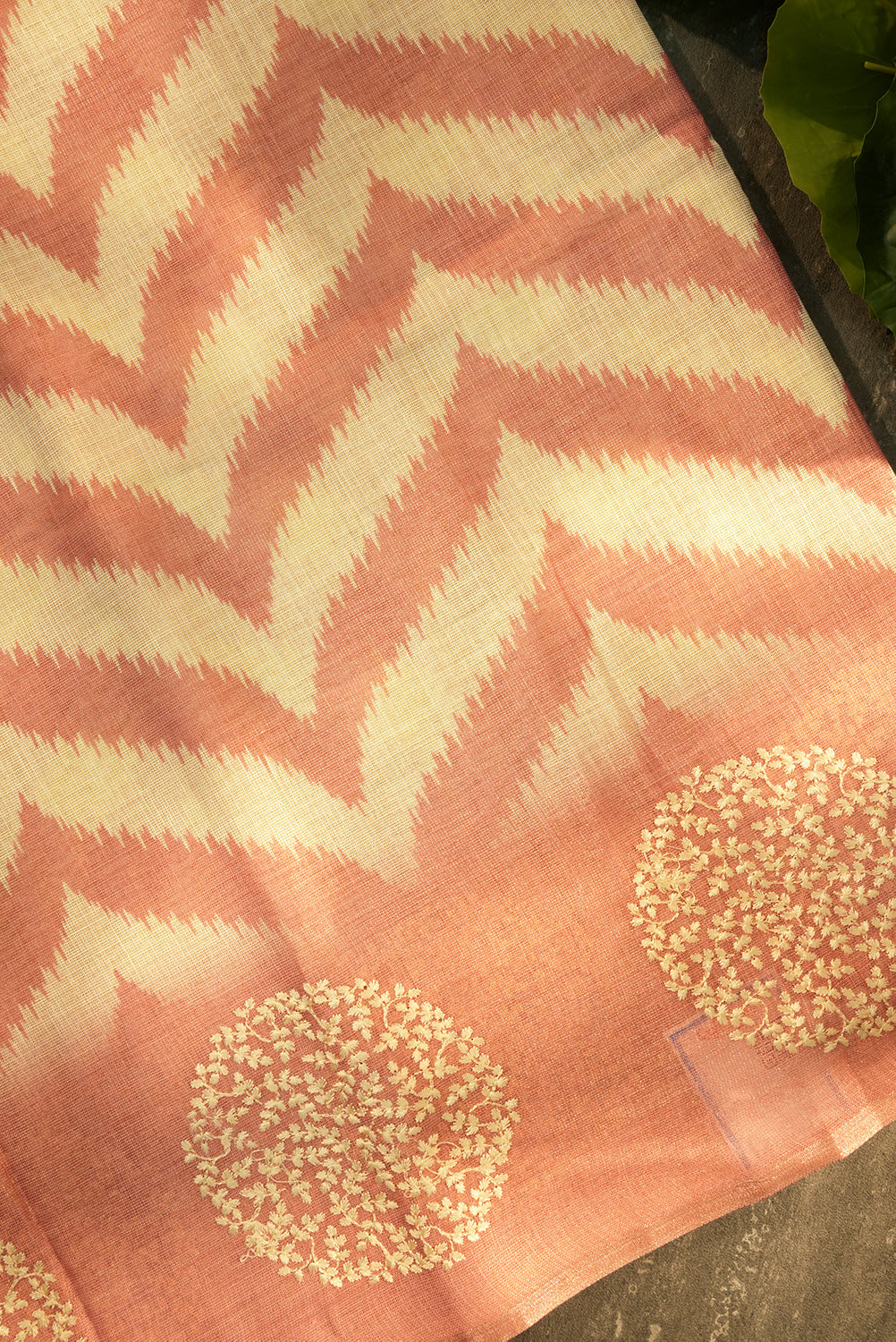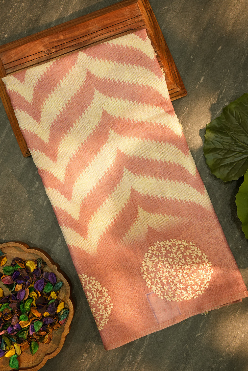 A chic and airy tissue linen saree in a beautiful rose-pink and cream combination. Its standout feature is the bold chevron pattern, paired with elegant medallion motifs. Unstitched blouse attached.