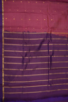 Embrace tradition with this royal purple silk saree. It showcases intricate golden polka dots and is framed by a solid purple border with a fine golden zari line, making it perfect for festive occasions. Unstitched blouse attached.