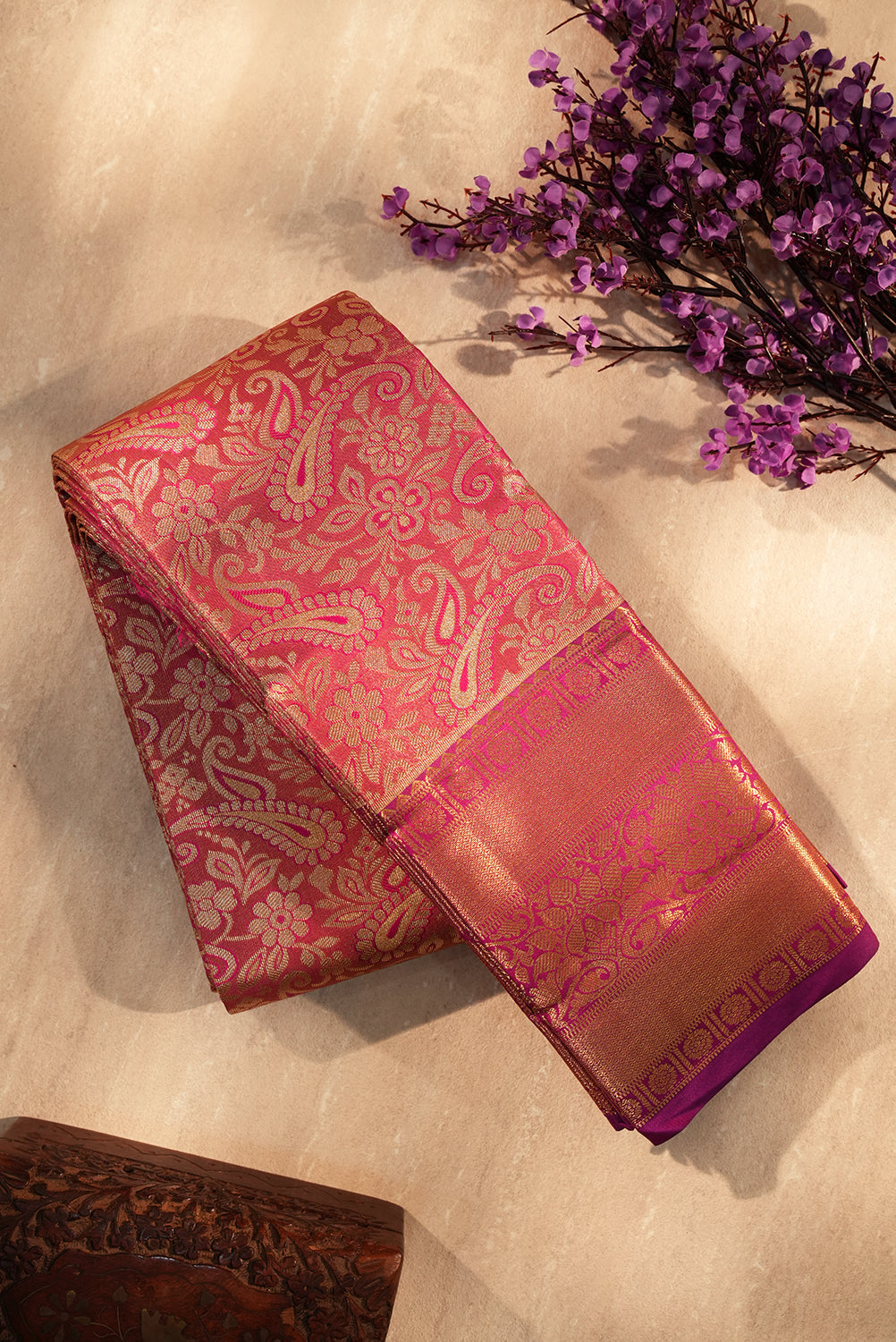 Embrace timeless elegance with this exquisite silk saree in a vibrant shade of Rani pink (magenta). The body is lavishly woven with intricate gold zari floral vines and paisley motifs, finished with a subtle violet-edged border for a look of pure grandeur. Unstitched blouse attached,