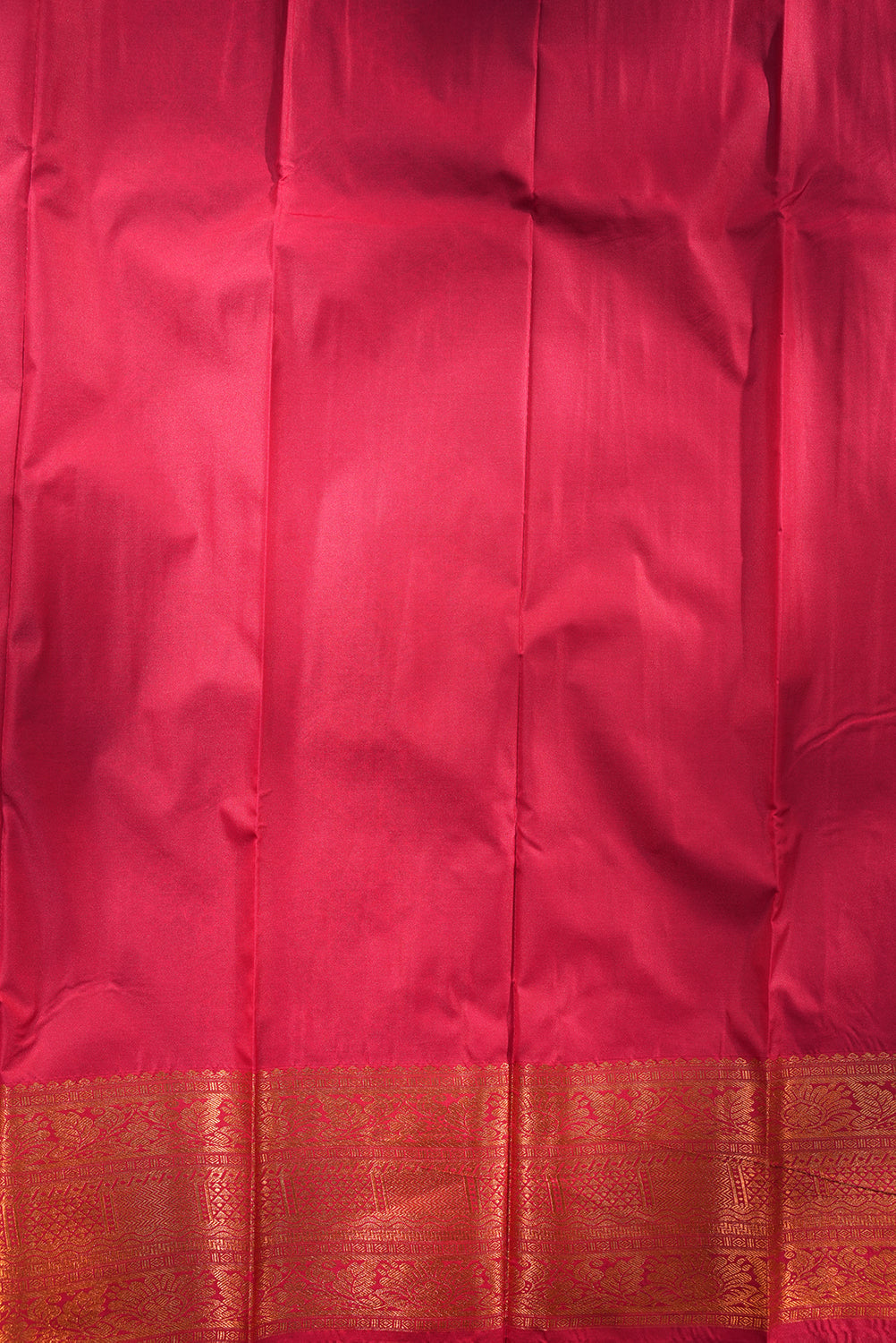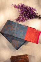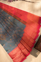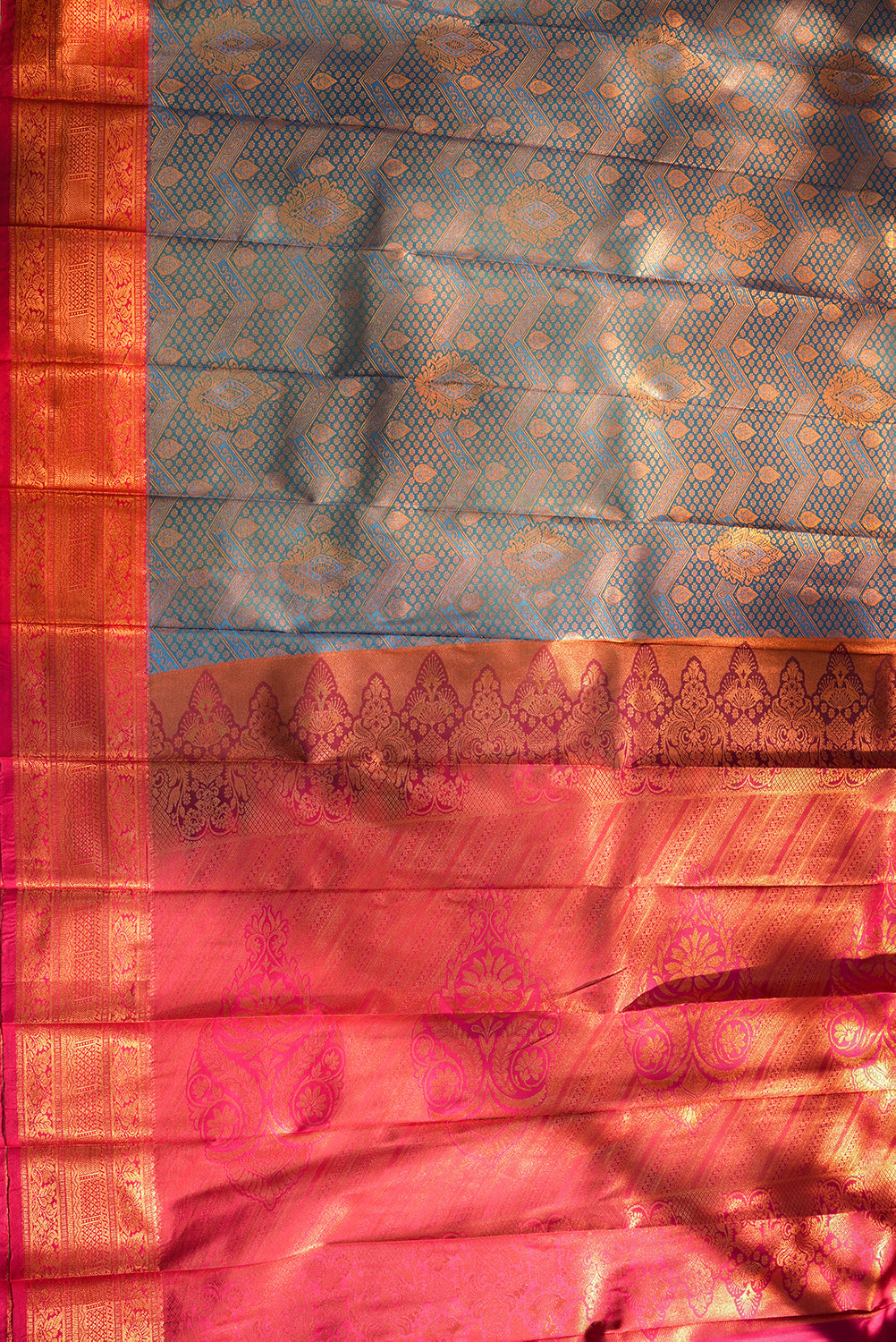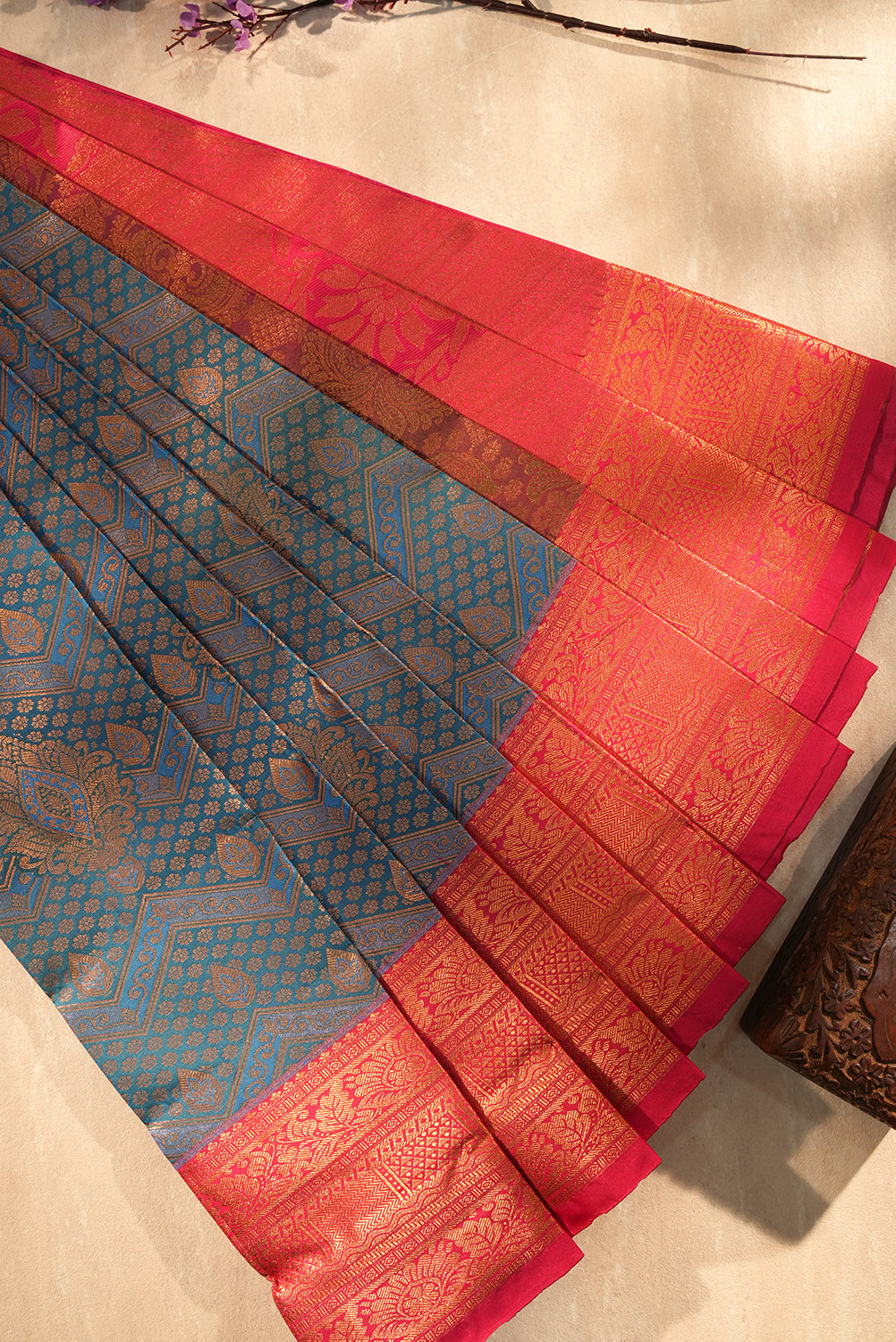 A luxurious teal blue body adorned with intricate gold zari chevron and paisley motifs. The look is beautifully contrasted by a vibrant coral-pink pallu featuring dense, traditional floral weaving. Unstitched blouse attached.