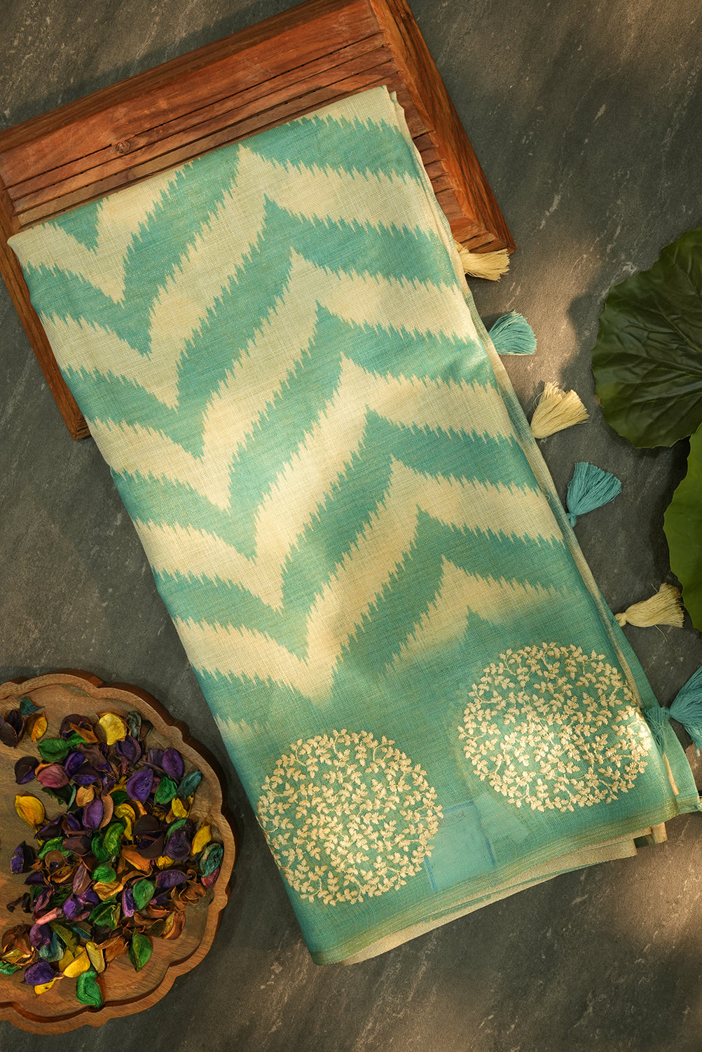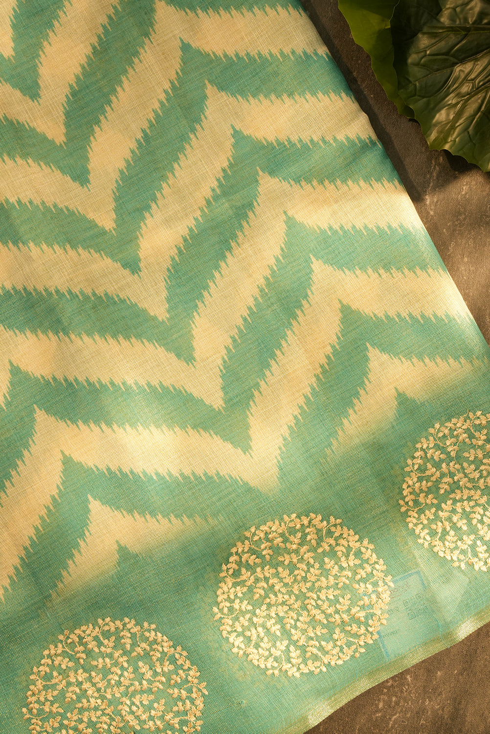 A stunning tissue linen saree featuring a contemporary chevron (zigzag) pattern in a refreshing sea green and elegant cream. The pallu is beautifully adorned with large, woven circular motifs and finished with matching tassels. Unstitched blouse attached.