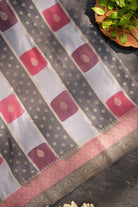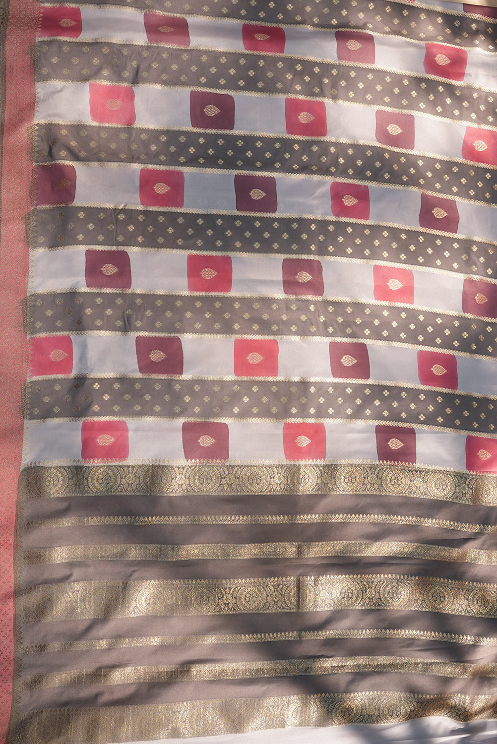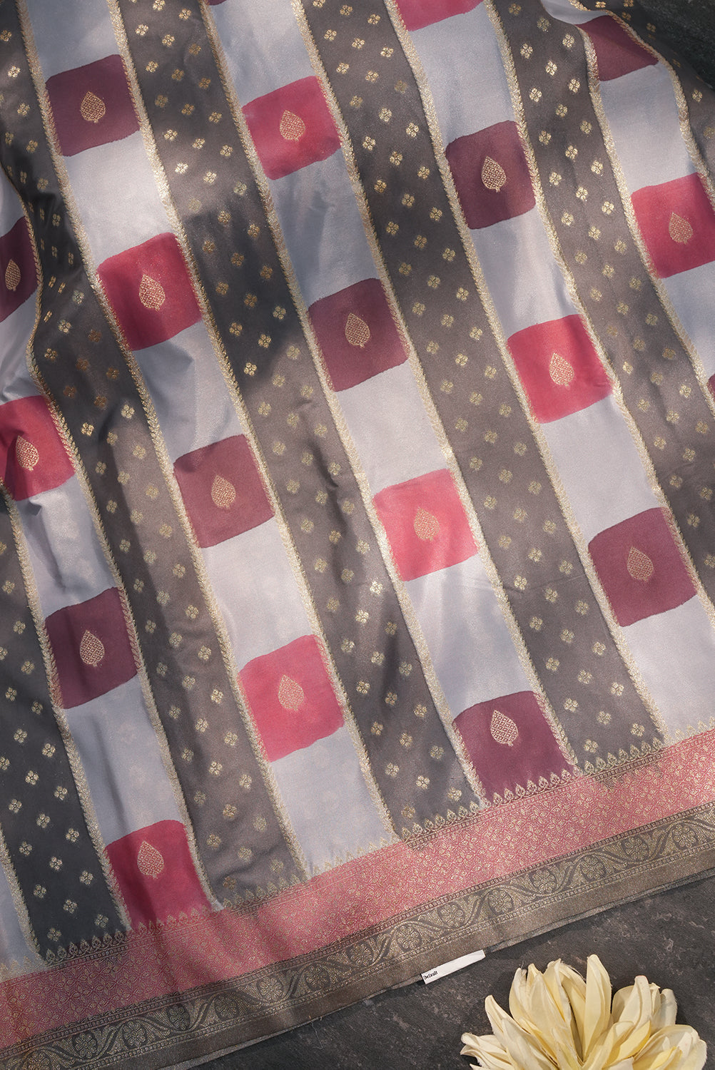 A stunning blend of modern design and traditional weaving. This Banarasi saree features a sophisticated silver-grey base patterned with geometric blocks in shades of deep wine and dusty pink. It is elegantly finished with antique gold zari leaf motifs and a rich floral border. Unstitched blouse attached.