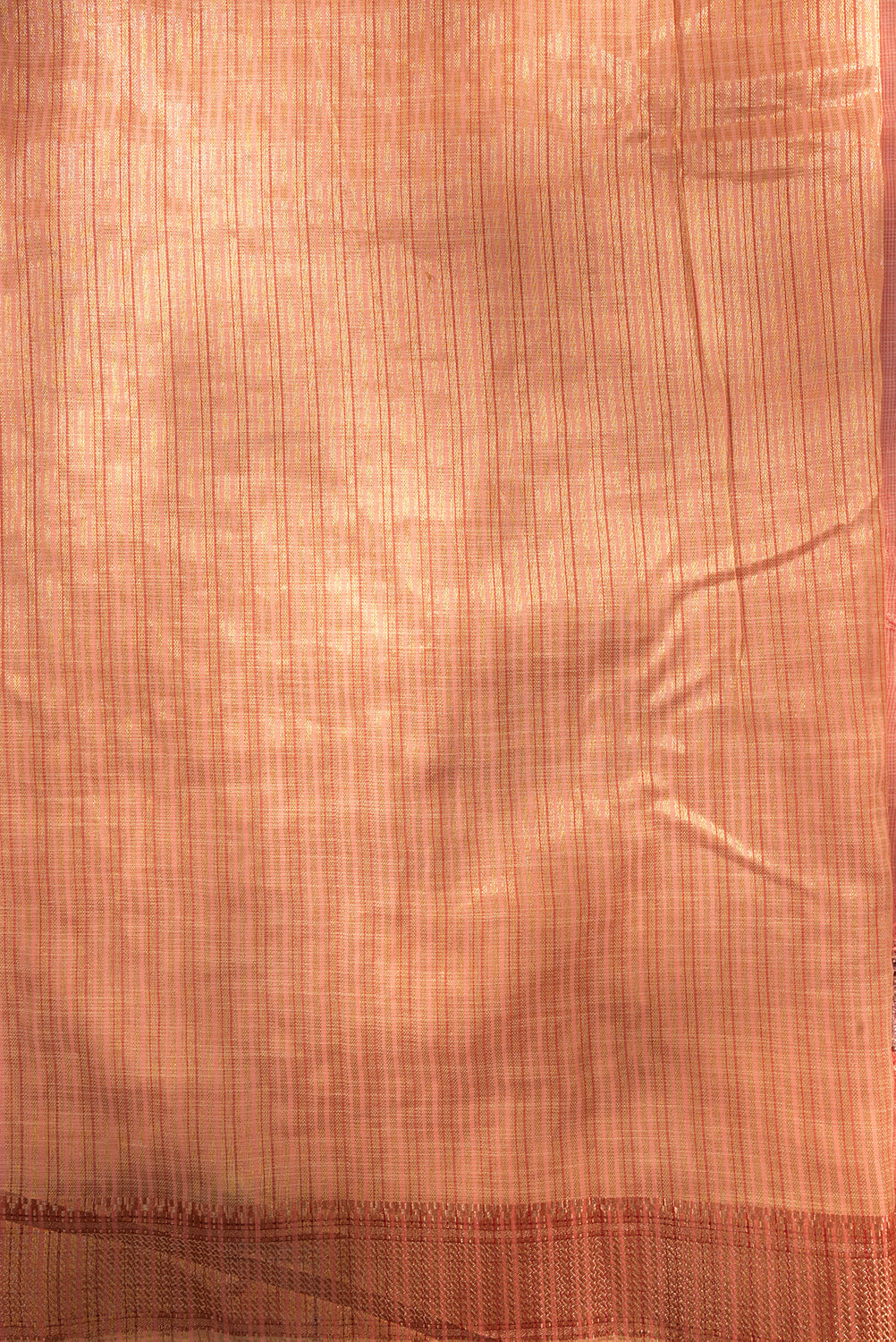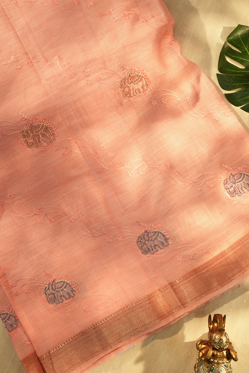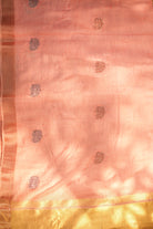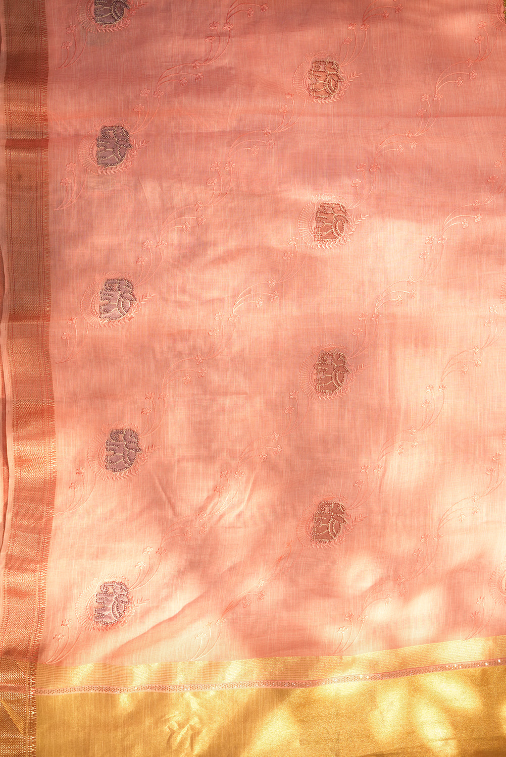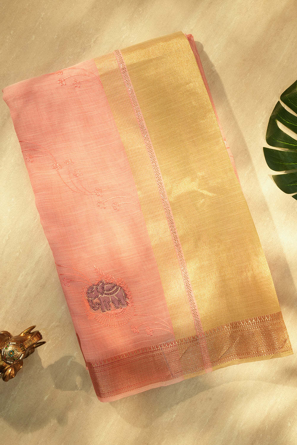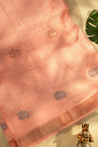 This beautiful, lightweight organza saree features a soft pink body with delicate floral embroidery. It is highlighted by a wide, shimmering gold zari pallu and a unique woven elephant motif. Unstitched blouse attached.