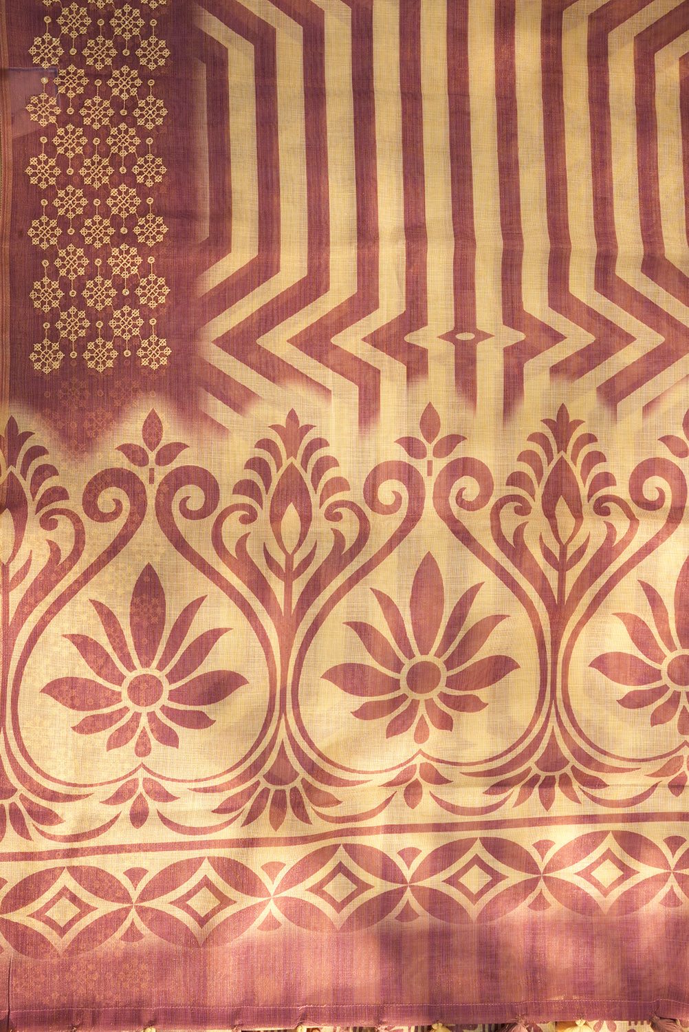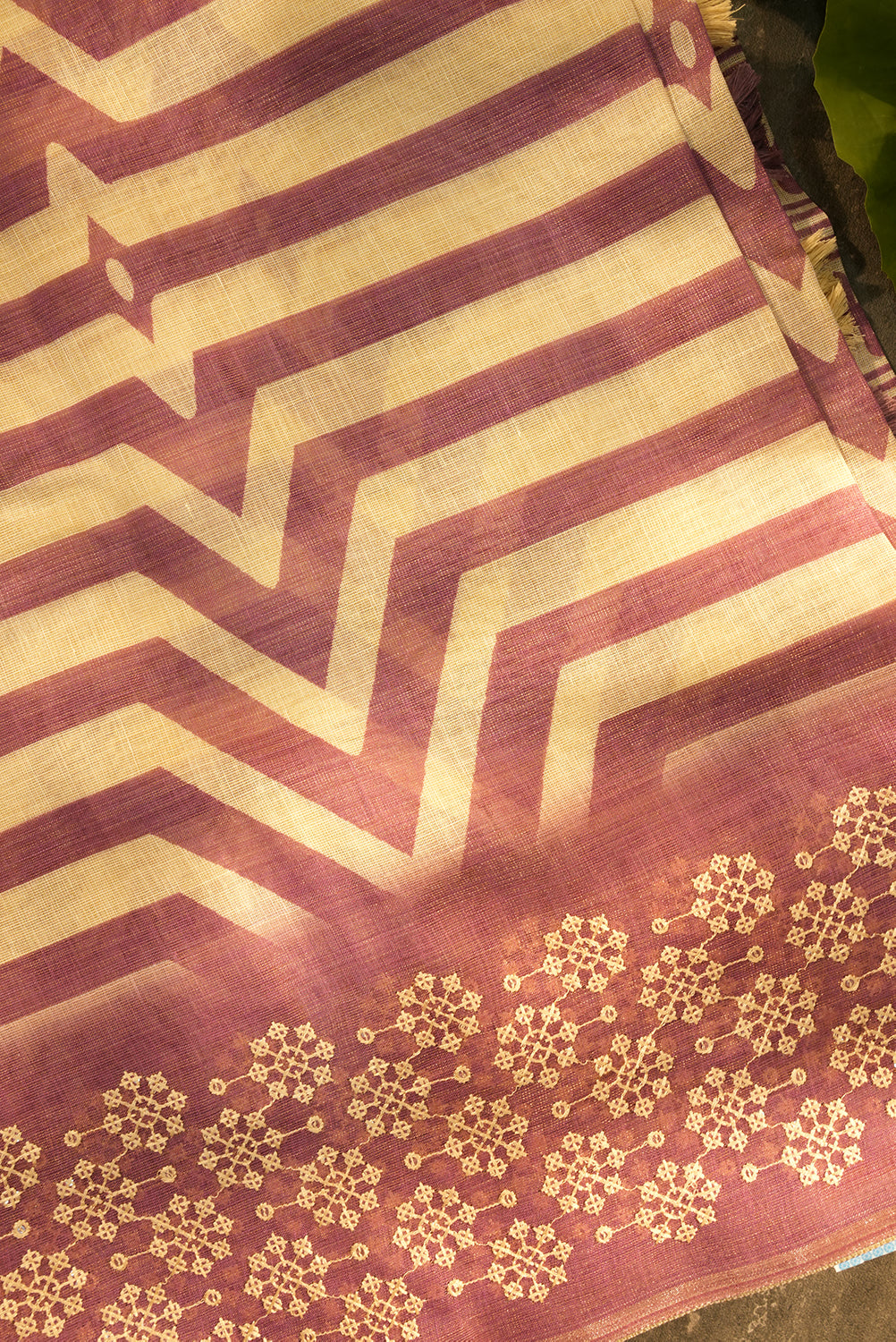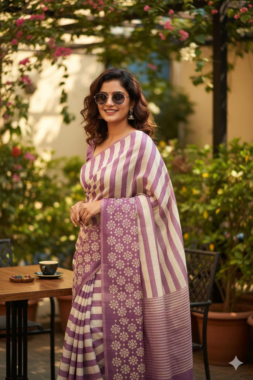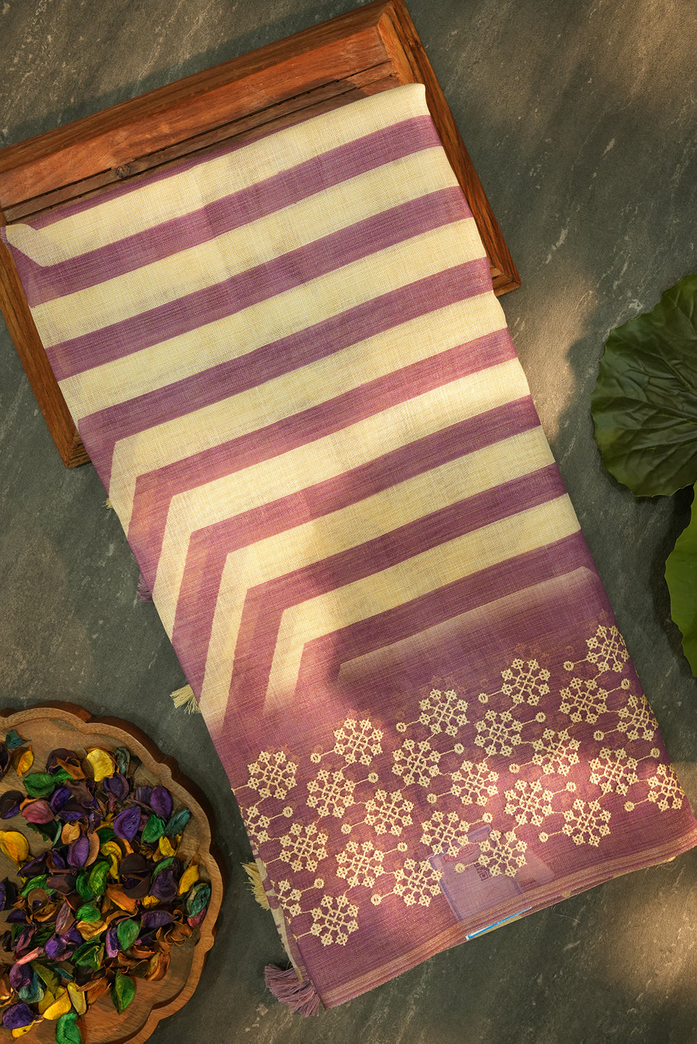 This beautiful saree features a striped body in a soft lavender and cream combination. The highlight is its chevron pattern, which elegantly separates the stripes from the solid lavender border adorned with intricate cream-colored weaving. Unstiched blouse attached.
