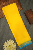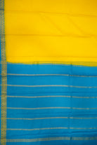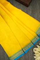 This vibrant Mysore silk saree features a bold and beautiful sunny yellow body, exuding a sense of joy and warmth. The luxurious fabric has a natural sheen, while the contrasting border in a striking light blue with a golden zari pattern adds a touch of modern elegance. This saree is perfect for festive occasions, daytime events, or any time you want to make a cheerful and sophisticated statement.