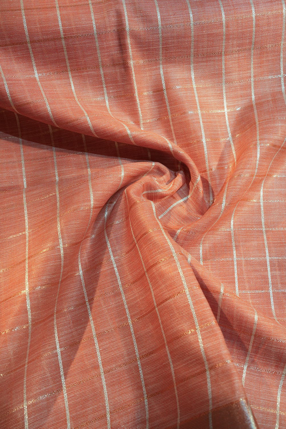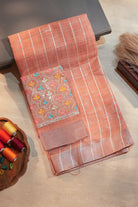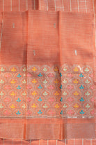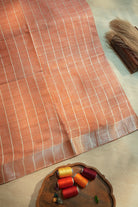 A sophisticated linen saree in an orange hue, featuring a refined grid of silver zari checks. The border is finished with a shimmering silver band, making it an ideal choice for both office wear and daytime gatherings. Unstitched blouse attached.