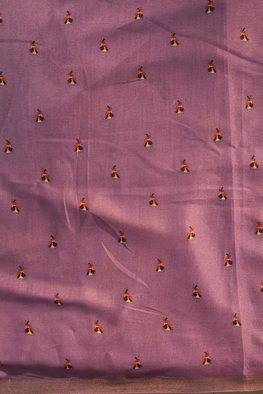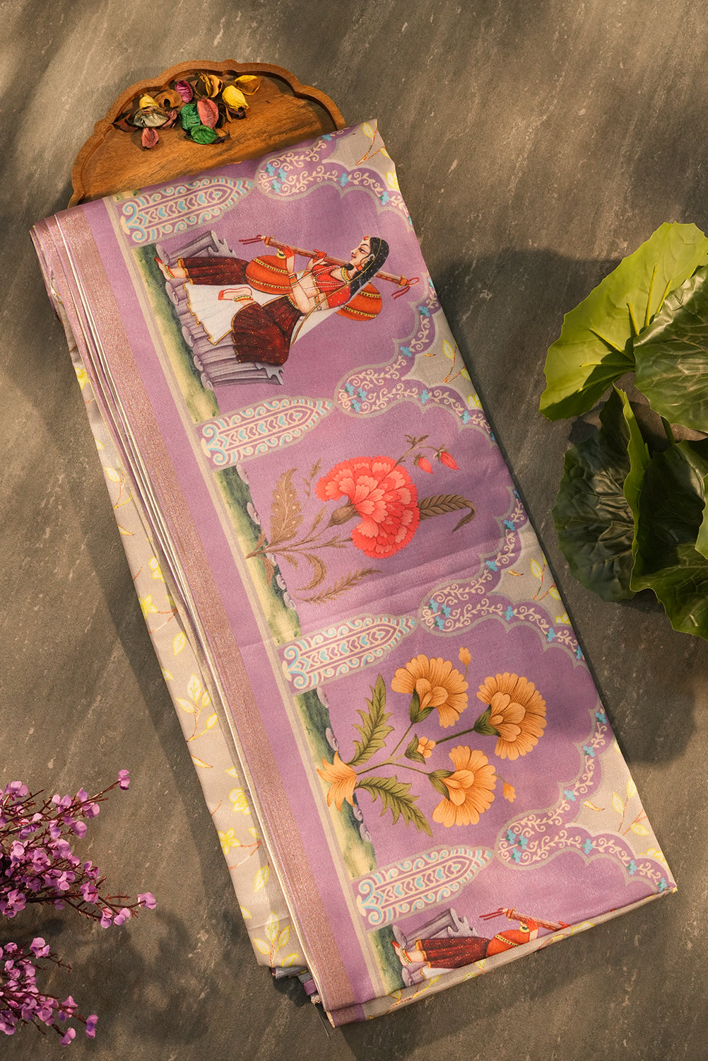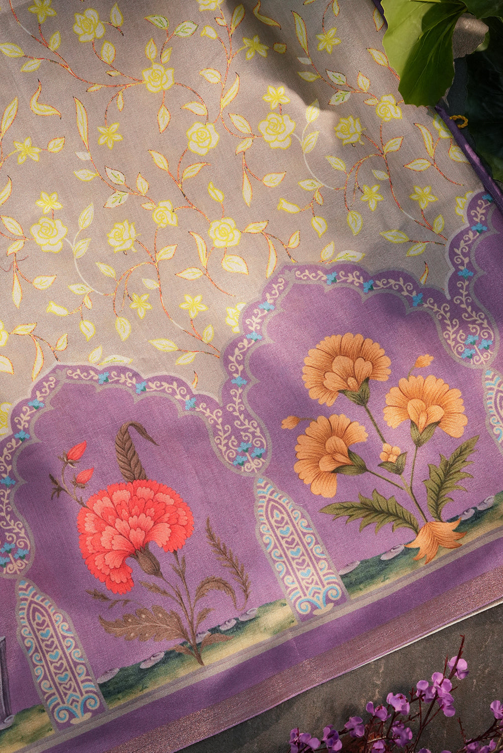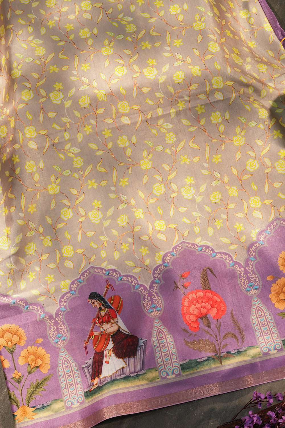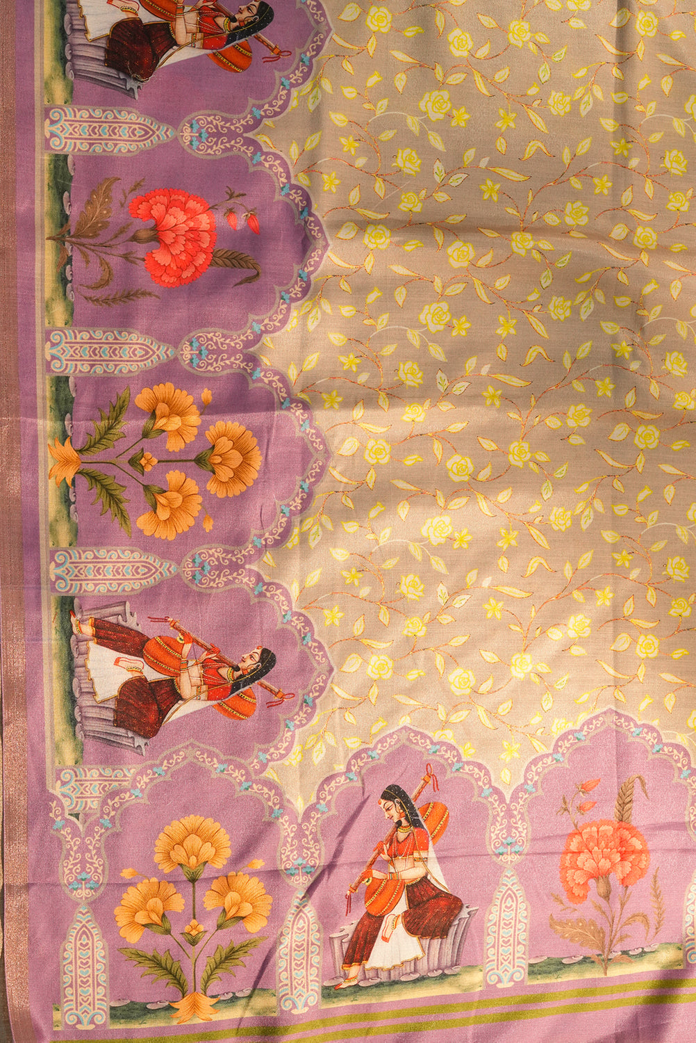 Celebrate the rhythm of heritage with this exquisite Tussar Silk saree. Featuring intricate Mughal-inspired arch motifs and hand-painted figures of musicians, the border is a canvas of purple and gold. The body glows in a soft champagne beige, adorned with a delicate yellow floral vine, making it a masterpiece for evening galas. Unstitched blouse attached.